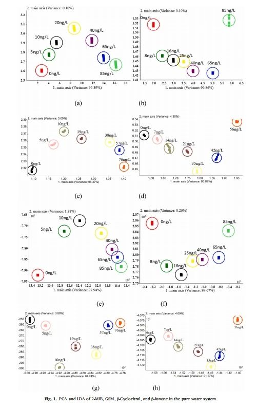图 1(e)、(f)、(g)和(h)展示了纯水中 2 - 甲基异冰片、土臭素、β- 环柠檬醛和 β- 紫罗兰酮的线性判别分析(LDA)结果。样本之间相隔一定距离,两个样本之间的距离越大,差异就越明显。2 - 甲基异冰片、土臭素、β- 环柠檬醛和 β- 紫罗兰酮的第一线性判别因子(LD1,x 轴)和第二线性判别因子(LD2,y 轴)占总方差的比例超过 99.00%。图 1(e)显示,在 0 到 40 纳克 / 升的浓度范围内可以区分 2 - 甲基异冰片,浓度在 40 至 85 纳克 / 升的样本与浓度在 5 至 20 纳克 / 升的样本可以区分开来,但浓度在 40 至 85 纳克 / 升的样本之间不能清晰区分,2 - 甲基异冰片的嗅觉阈值浓度为 8.5 纳克 / 升。从图 1(f)可以看出,低浓度(8 至 16 纳克 / 升)和高浓度的土臭素能清晰区分开来。